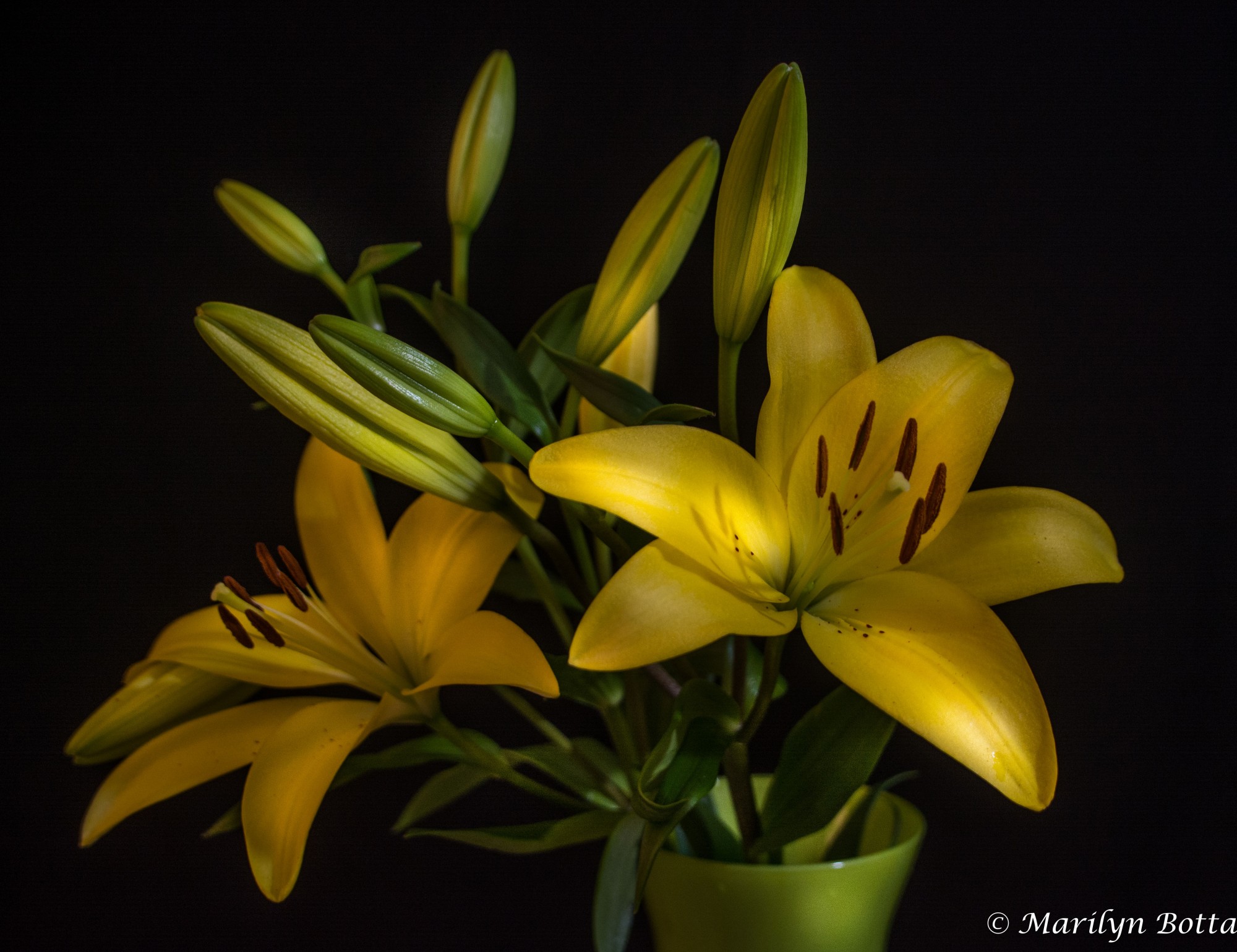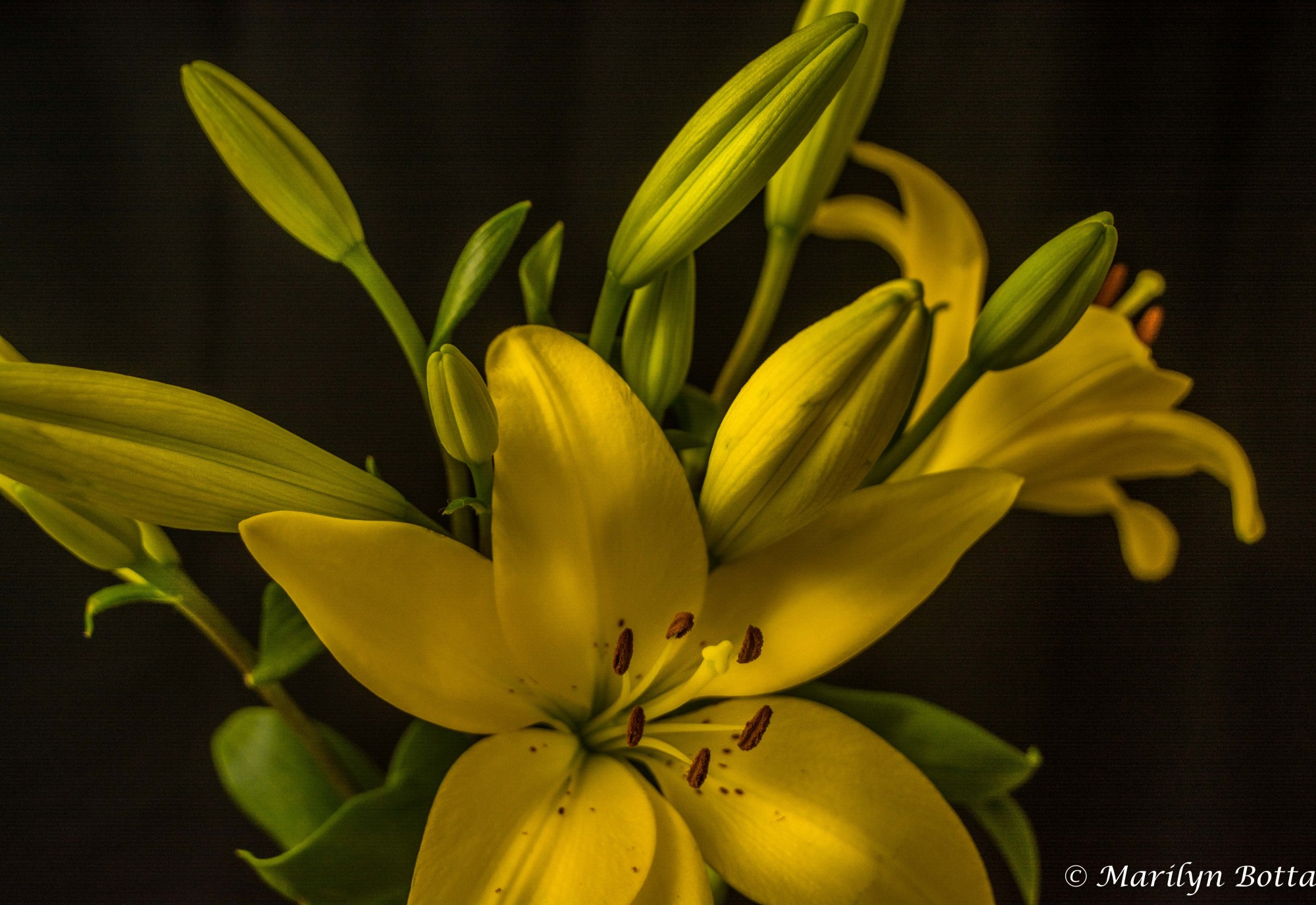 I found an orange wax candle, and a peach and cream colored ceramic vase while looking for items to use in my still life. The vase was matched with some gorgeous orange lilies which offset the orange in the candle. Two red apples were placed at the base of the candle holder, and added a gray stone vase with little baby yellow carnations was added. The entire composition was offset by a beautiful texture I added as a background. There is a lovely contrast between the rustic vases and the vibrant colors of the flowers.